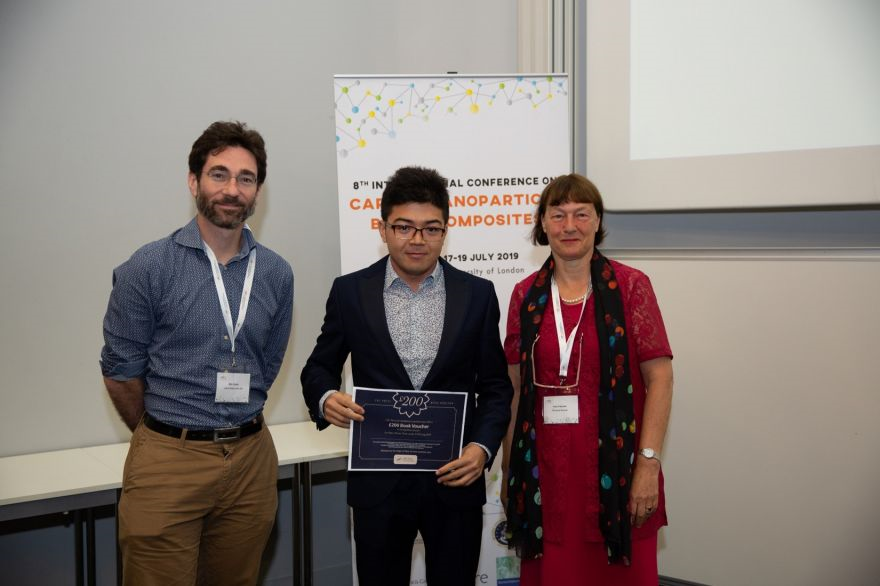 Yunfu Ou (IMDEA, Spain) presented with the 1st Place Poster Prize at CNPComp2019 by Prof. Petra Pötschke (IPF Dresden, Germany) & Prof. Milo Shaffer (Imperial College London, UK), 17 July 2019.
